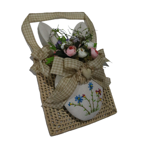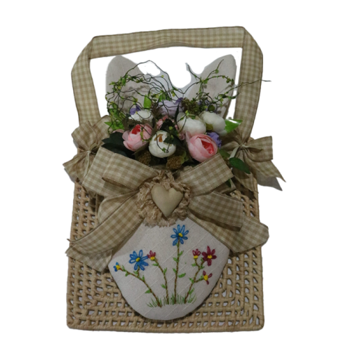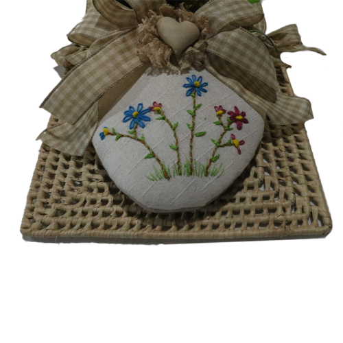 Encante-se com este delicado porta flores feito à mão, combinando charme rústico e detalhes artesanais. O arranjo traz uma mistura de flores artificiais realistas, que se destacam sobre o tecido bordado com flores coloridas, finalizado com um laço xadrez suave e um pequeno coração central, conferindo um toque de romantismo e carinho.
