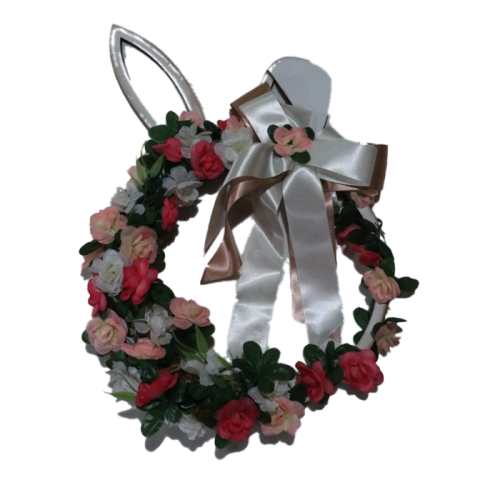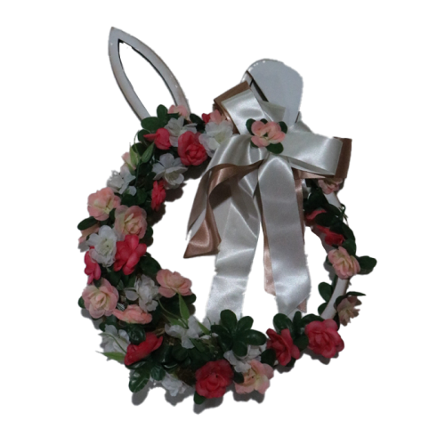 Decore sua casa com a alegria e a delicadeza desta guirlanda artesanal em formato de coelho. Com flores artificiais em tons de rosa e branco, folhagens verdes realistas e laço de cetim sofisticado, esta peça traz um toque de charme e frescor à sua decoração. As orelhas do coelho dão personalidade e tornam a guirlanda única, perfeita para pendurar em portas, paredes ou janelas.