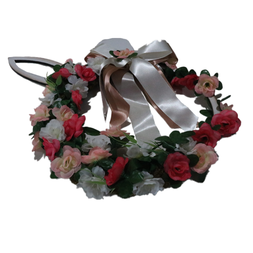 - Material: Estrutura em madeira, flores artificiais e laço de cetim
