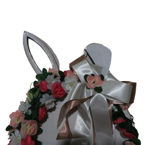 - Detalhes: Formato de coelho, flores em tons suaves, laço decorativo