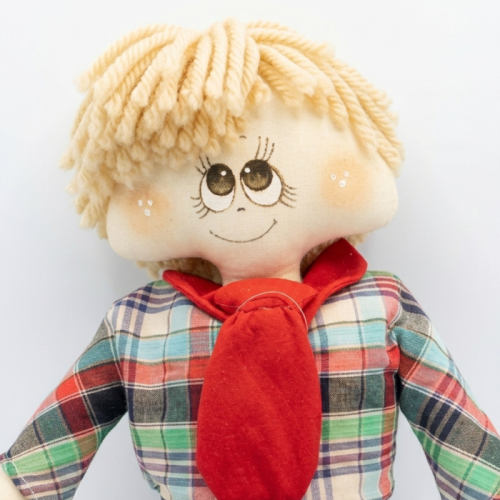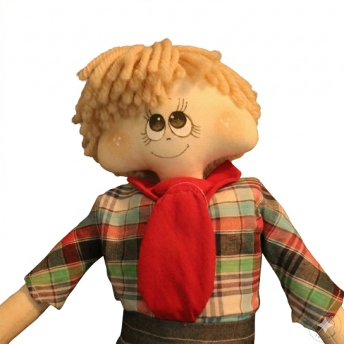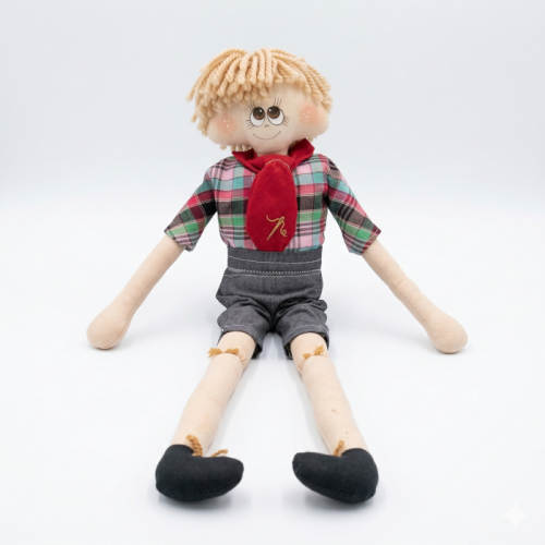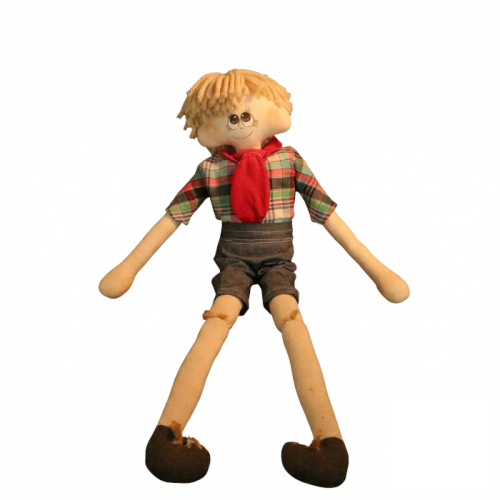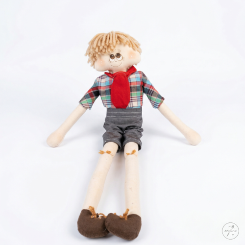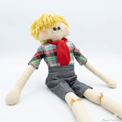 Vestido com camisa xadrez, bermuda e um lenço vermelho que adiciona charme ao visual, o boneco se destaca pelos detalhes cuidadosamente trabalhados — desde o cabelo em tecido até os acabamentos das roupas. Suas pernas longas e flexíveis permitem que ele seja acomodado em prateleiras, bancos ou aparadores, criando um efeito descontraído e encantador.