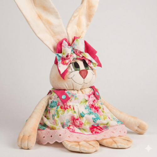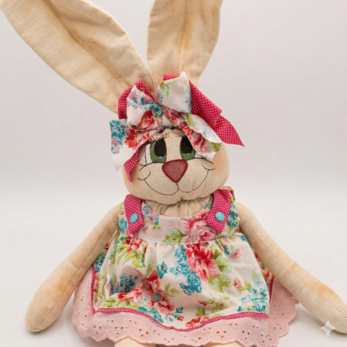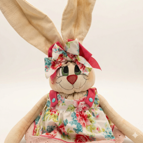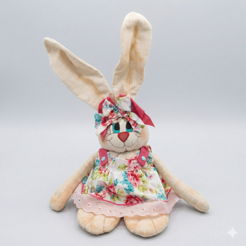 Encante-se com esta adorável coelhinha de pano artesanal, feita à mão com atenção aos detalhes. Seu vestido floral delicado, com acabamento em renda e detalhes em vermelho, combina perfeitamente com o laço na cabeça, transmitindo charme e personalidade à peça.