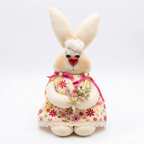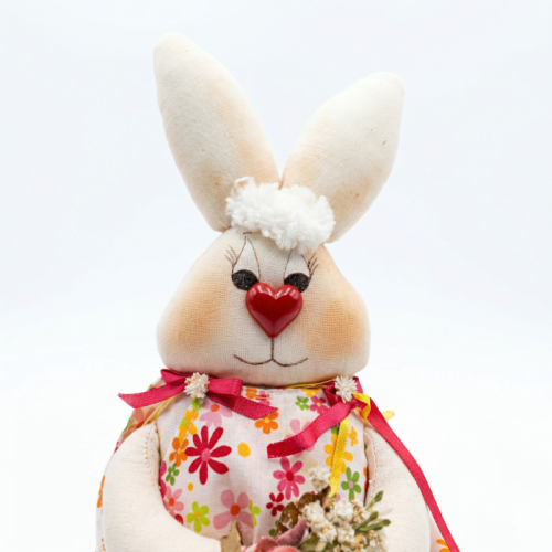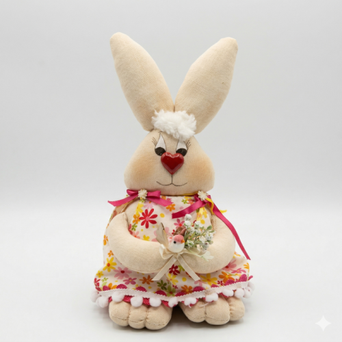 Encante-se com esta coelhinha de pano artesanal, feita à mão com atenção aos detalhes. Seu vestido floral colorido, com acabamento delicado, é complementado por laços em tons vibrantes, transmitindo charme e alegria à peça. O coração vermelho no nariz adiciona um toque divertido e lúdico, enquanto os olhos bordados e o pequeno topete conferem personalidade e ternura.