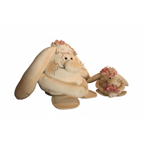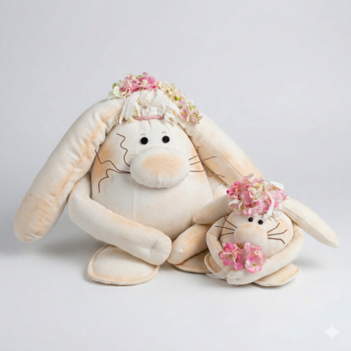 Transforme seu espaço com o charme delicado deste par de coelhos de tecido, meticulosamente confeccionados à mão. Cada detalhe foi pensado para transmitir aconchego e personalidade: das orelhas longas e maleáveis aos rostinhos simpáticos com bochechas levemente rosadas e bigodinhos bordados à mão.