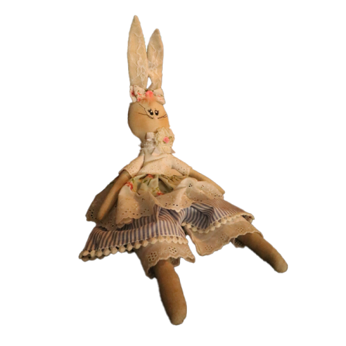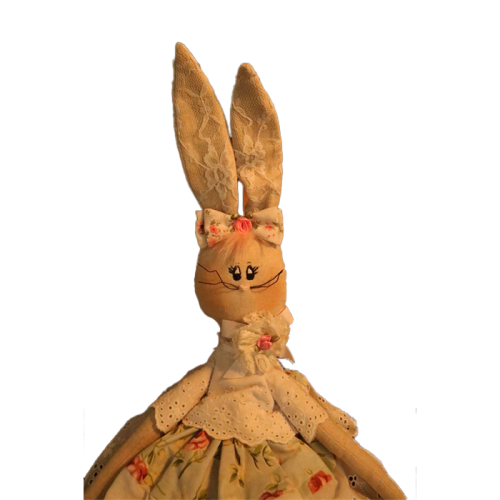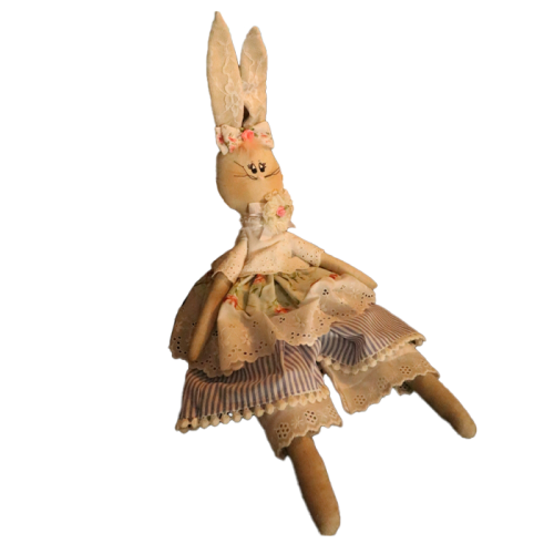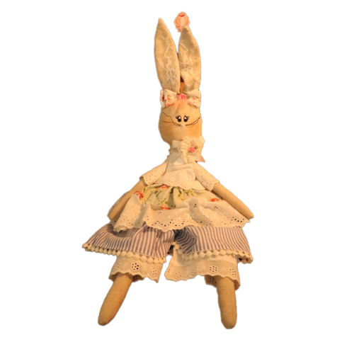 Encante-se com esta coelhinha de pano artesanal, cuidadosamente feita à mão com atenção aos detalhes. Seu vestido romântico, com camadas de tecidos florais e listrados, delicados babados e acabamento em renda e pompons, confere um charme elegante e sofisticado à peça. O laço na cabeça e o pequeno detalhe floral completam o visual com delicadeza.